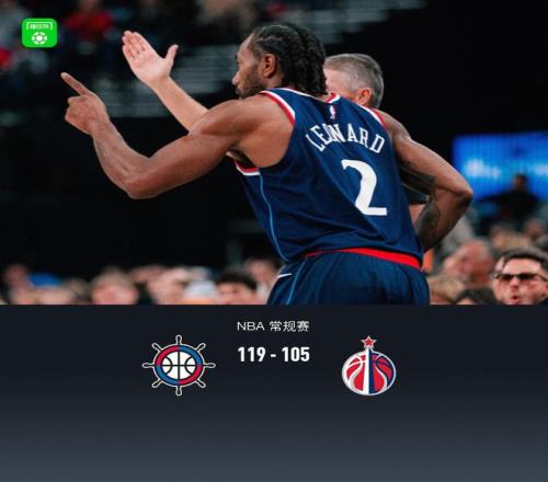 第四节快船伦纳德拿下14分,奇才凯肖恩-乔治拿下4分,最终快船119-105战胜奇才